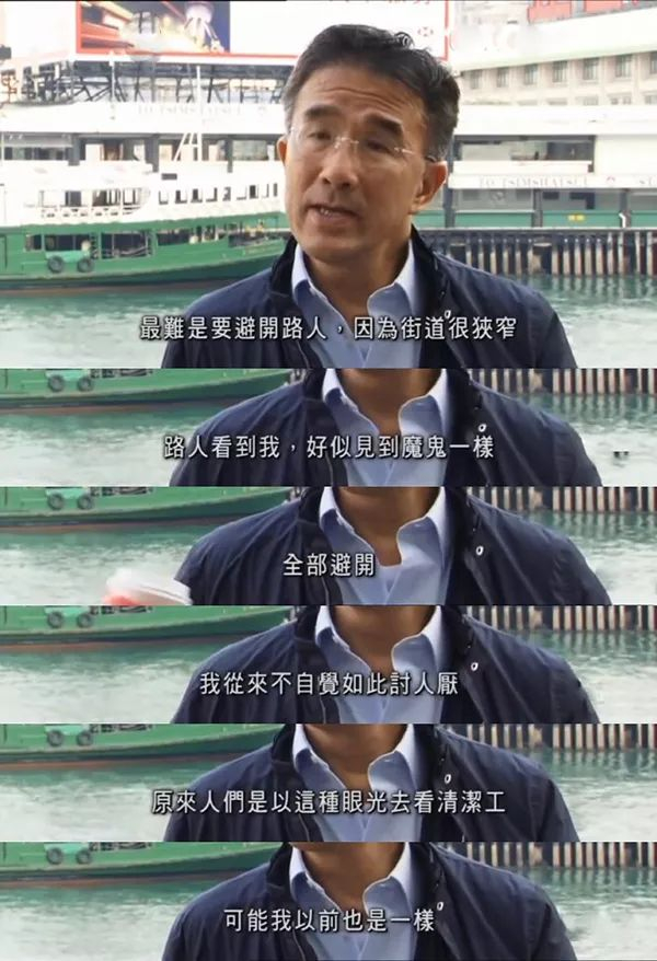 其中,让他感受最深,是发现社会对厌恶性工作者的歧视,已经深入潜意识,他自己都不曾意识到:“我从来不自觉如此讨人厌。原来人们是以这种眼光去看清洁工,很可能我以前也是一样。”