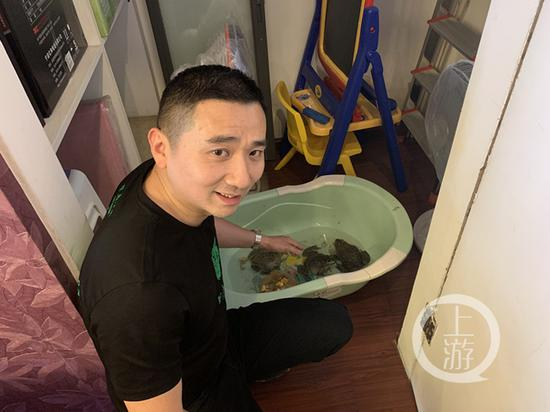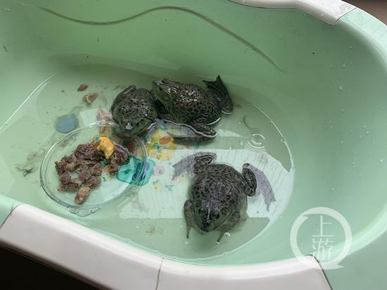 今(13)日下午1时许,在罗先生家中,上游新闻记者见到了养在盆里的三只牛蛙,罗先生说,其中体型略大,肚皮发灰的一只,正是会“外语”的牛蛙。而旁边的两只牛蛙则是一批运送过来的,沾了“室友”的光,一并免于宰杀。