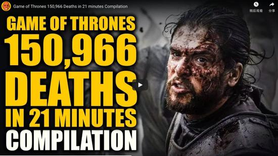 《权力的游戏》的剧情可以说暴力又血腥,7季中死掉的人物不计其数。一位名为Leon Andrew Razon的YouTube视频制作者不嫌麻烦,在2017年6月制作了一个21分钟的视频,集合了所有死亡的瞬间。据他统计,前6季中,至少有150966个生物在镜头中死亡,不仅包括人类,还包括马匹、鸽子等各种动物。