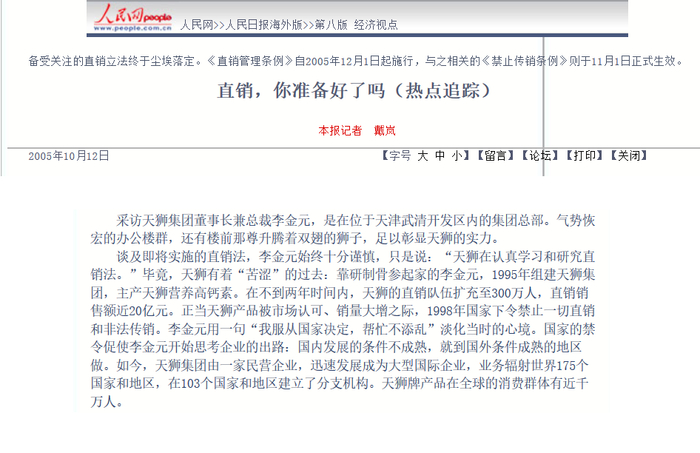 20世纪90年代末,作为舶来品的直销模式在中国迅猛发展后,开始显现传销的特征。1998年,国务院颁布《关于禁止传销经营活动的通知》,禁止直销、传销。在上述人民日报海外版的报道中,李金元以“服从国家安排,不添乱”来描述当时的心情。《天狮风云录》一文提到,在全面禁止传销之后,国家允许十家外资企业以“店铺+推销员”的方式转型,天津市政府也给天狮发了一份类似的政策许可。但是天狮高层认定直销模式更有前景,因此决定规避禁令,向海外求发展。
