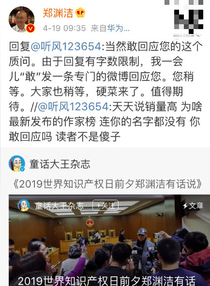 18日,有机构发布的童书作家榜单引发热议。在这份榜单上,为人熟知的“童话大王”郑渊洁并未上榜。19日,有网友发微博就此质疑郑渊洁,郑渊洁则在当天稍晚间发长文回应此事,指出榜单内部分童书作家,依靠进校园推销获得高版税收入,质疑其做法有进校园推销之嫌。该文章很快引发网友热议。