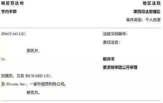 4月16日,刘强东性侵案女主Jingyao Liu正式向明尼苏达地方法院提起诉讼,并公开完整诉状,公开了自己的姓名。起诉书中完整描述了刘姓女留学生受到侵害的全过程,并就此对刘强东提出包括民事胁迫与人身侵犯、非法拘禁、基于性的侵犯与侵害在内的主张以及对京东集团提出的上述违法行为的连带责任主张。