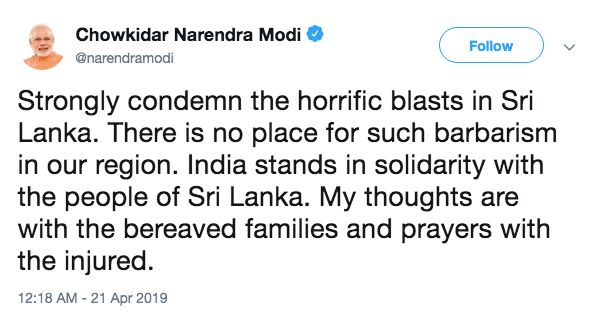 印度总理莫迪在社交媒体推特上发文表示,”强烈谴责发生在斯里兰克的恐怖爆炸袭击。我们的地区不容许有这样暴虐的行为。印度和斯里兰卡人民坚定地站在一起。向遇难者家属和伤员致以慰问。”