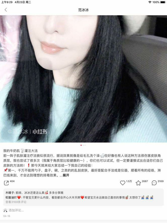 4月16日,范冰冰的小红书再次更新,分享“牛奶肌灌注大法”。她在小红书愈发密集的更新频率预示着她将不再沉默,而是开始通过社交媒体等平台逐渐重回公共视野。