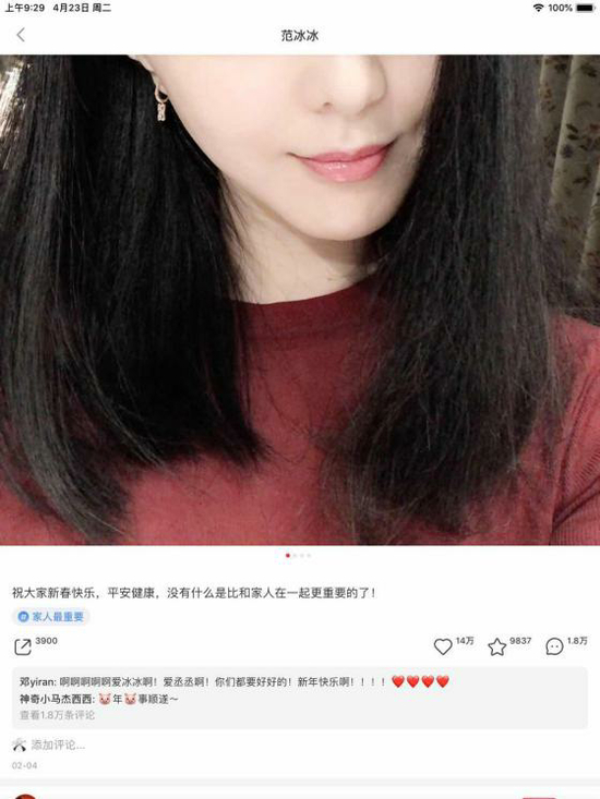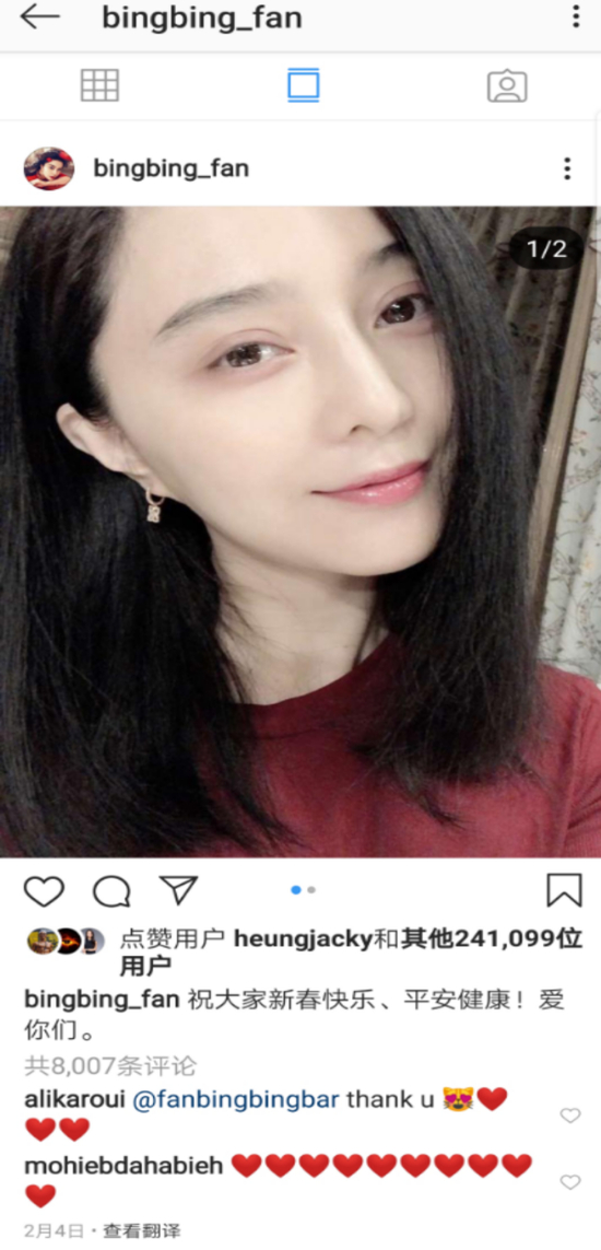 直到2019年春节,2月4日,沉寂多时的范冰冰同时在个人ins和小红书账户中更新了个人近期自拍照,并配文称:“祝大家新春快乐,平安健康,没有什么是比和家人在一起更重要的了!”这一条动态获小红书用户点赞14万,留言1.8万;获ins用户点赞24万,评论8000余条。