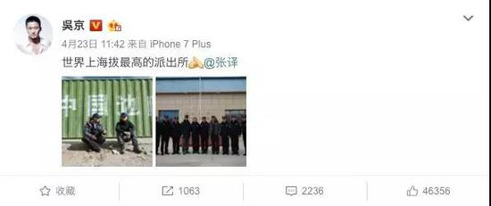4月23日中午11点,吴京发了一条微博,配文“世界上海拔最高的派出所”,并@了另外一名演员张译。微博中有两张图片,第一张是吴京和张译两人坐在地上的合照,背后几个大字“中国边防”。第二张则是两人与派出所民警们的合照。