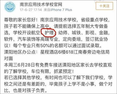 此外,《每日经济新闻》记者在南京应用技术学校官方微博上看到,一篇发布日期为2017年6月27日的文字微博显示:“南京应用技术学校,省重点学校,孩子若不能确保上高中,请提前选择5年制大专做备选。学校开设航空、护理、幼师、城铁、影视、金融、软件、汽车装饰等高端专业。”