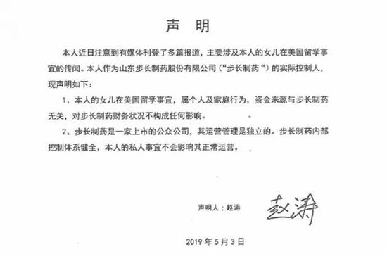 5月3日,步长制药董事长赵涛在公司官网发布声明称,其女儿在美留学资金来源与步长制药无关,对步长制药财务状况不构成任何影响。