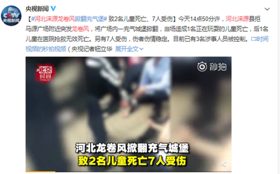 本该盛满欢声笑语的游乐场所,却成了伤痕累累的伤心地,这样的事故怎能不令人痛心?5月2日14点50分许,涞源县拒马源广场附近突发龙卷风,将广场内一充气城堡掀翻,造成儿童2人死亡,7人受伤。无独有偶的是,5月1日,成都“孩子的院子”亲子乐园发生游客冲出滑梯防护设施事故,造成14名游客受伤,其中2名成人伤者经抢救无效死亡。