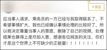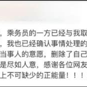 另据梨视频5月5日报道,爆料该事件的网友已经删除了相关视频,并发文表示“应当事人要求,乘务员的一方已经与我取得了联系,不希望事情扩大”,该网友还称其“已经确认事情处理的比较好了”,“处理结果也算得上尽如人意”。
