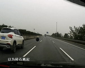车载视频中看到,一个黑色的物体突然出现,砸向车前玻璃,车主以为碎石溅起。