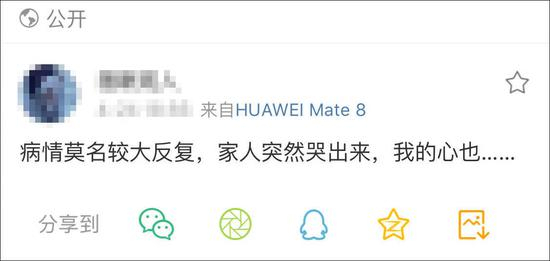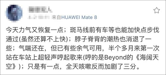 他偶尔也会分享自己病情好转的情况:比如斑马线前等车能够加快步伐通过、脖子的潮热消退一些、气喘还在。。。。。。