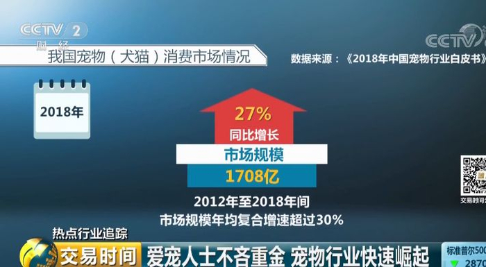 《2018年中国宠物行业白皮书》显示,去年,我国宠物(犬猫)消费市场规模达到1708亿元,同比增长了27%,自2012年至2018年七年间,我国宠物行业年均复合增速超过30%