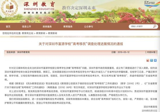 5月12日晚11时57分,深圳市教育局发布通报称,深圳市富源学校2019年高考报名考生中,有32名考生属“高考移民”。对此,深圳市教育局将取消这些考生在深圳市的高考报名资格,核减富源学校2019年高中招生计划的50%。