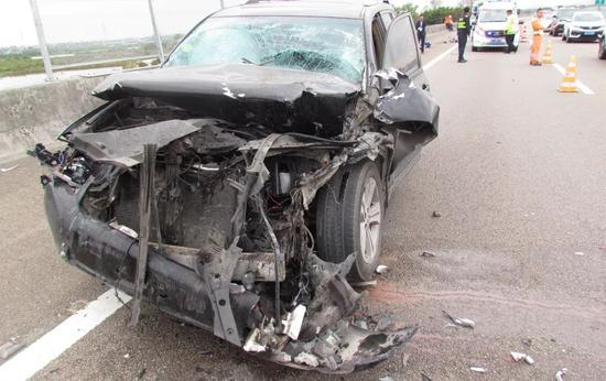 前方20米处,汉兰达SUV压住实线停在应急车道边上,车头撞烂,引擎盖被掀起,挡风玻璃破裂,右侧倒后镜不翼而飞。▼