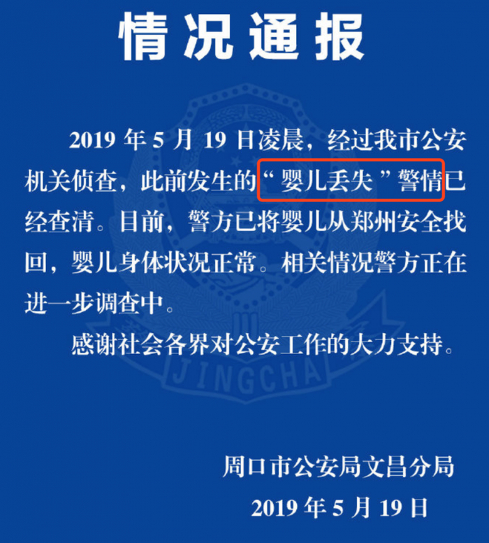 就在大家好奇事情原委时,警方发布了新的通报。但很快,细心的网友发现,这份通报在表述上与此前的通报差别较大。5月16日晚,当地警方将男婴失踪一事描述为“盗婴案”。但5月19日,警方发布婴儿被安全找回的消息时,没有使用“被盗”的表述,而是称“婴儿丢失”。