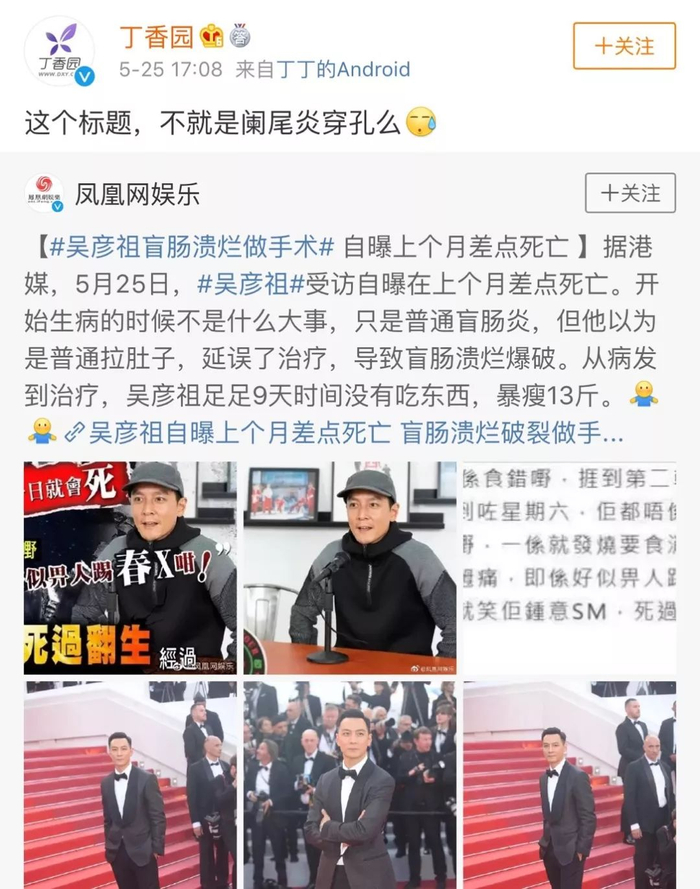 但在医学上,盲肠炎范围较模糊,原来阑尾炎也叫盲肠炎,@丁香园表示,男神可能是阑尾炎穿孔: