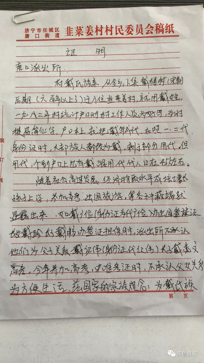 济宁市唐口街道韭菜姜村戴姓一族,600年前由济宁市金乡县卜集镇戴楼村迁至此处,一脉相传,繁衍生息。从37年前户口统计时,工作人员为了方便书写将部分戴姓写成了“代”。由于不是同一时期同一人统计,造成父子之间、兄弟之间不同姓,给村民带了很多麻烦。5月16日,济宁市中公安分局唐口派出所民警收到由韭菜姜村委提交的申请后,5天为45名村民集体改姓。