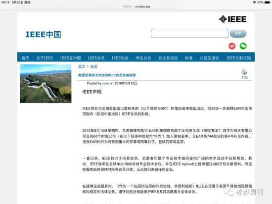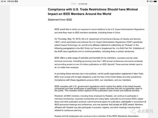中青在线北京5月30日电(中国青年报·中青在线记者 张国 马宇平)国际电气与电子工程师协会(简称IEEE)北京时间今天早晨在其中文官网发布一份中英文声明说:“美国政府的法规限制了华为公司及其员工无法参与IEEE一些通常不向公众开放的活动,包括一部分的出版物的同行评议和编辑过程,而IEEE需要合规。”