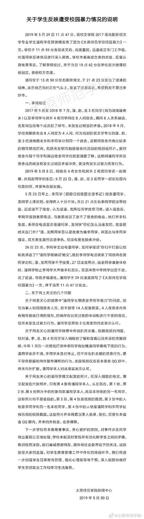 2019年5月29日11点47分,我校文学院2017级戏剧影视文学专业学生潘同学在其微博发布了题为《太原师范学院校园暴力》一文。学校于11点59分发现该文后,高度重视,迅速成立专门工作组,对潘同学反映情况进行深入调查。学校本着高度负责的态度,反复认真核查事实,了解事情经过,并于当日19点42分在学校官方微博积极回应,表明校方态度。