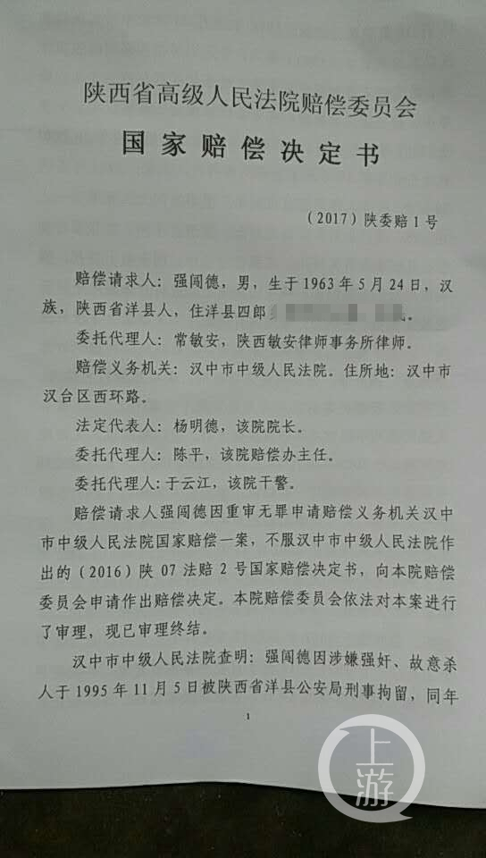 决定书下达后,汉中市中院相关负责人告诉强闯德,赔偿已经进入申报程序,赔偿款到位后,将一次性支付给强闯德。