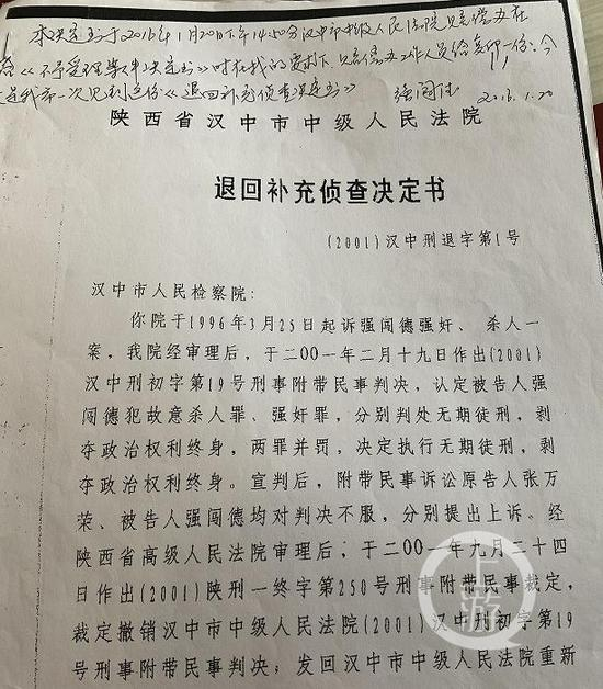 7个月后的2001年9月24日,陕西省高院出具《陕西省高级人民法院刑事附带民事裁决书(2001)陕刑一第250号》,以原审判决事实不清,证据不足为由,撤销一审判决,责令发回汉中市中院重审。