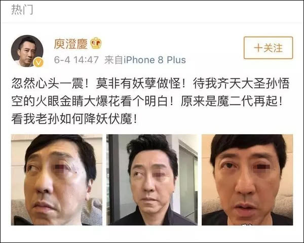 6月4日14:47,庾澄庆在微博上发了3张自拍,照片中他的左眼充血,眼白全被染红,情况上看上去比较严重,非常吓人。粉丝纷纷留言,让哈林哥注意身体。