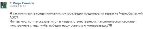 网友伊戈尔·索科洛夫:“我想最后(苏联)反间谍上校会阻止切尔诺贝利核电站爆炸?还是你的意思是,在我们的国内爱国电视剧中,外国情报机构将击败我们的苏联反情报机构?!!”