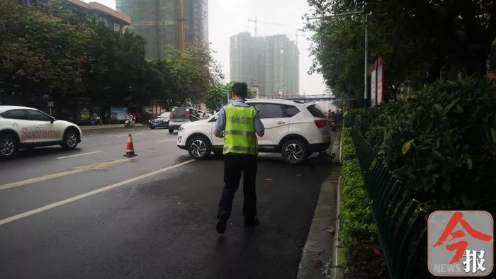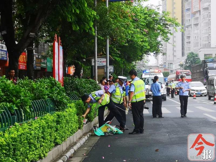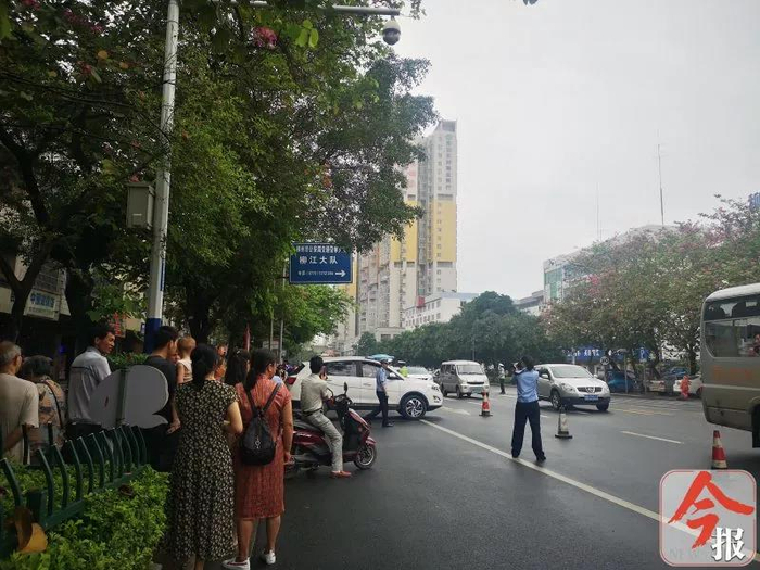 在事发现场,一辆桂A车牌的白色宝骏SUV横停在柳江交警大队马路对面的非机动车道上,车底压着一辆绿色的婴儿车,交警正在现场调查。