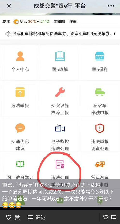 通过手机微信APP客户端,搜索成都交警“蓉e行”平台微信公众号,在通过“蓉e行”平台绑定驾驶证和本人名下的机动车后,即可进入违法处理“学习减分”功能。