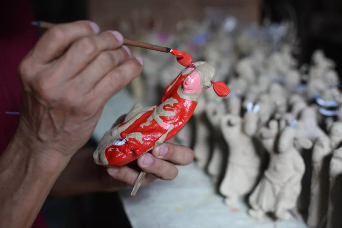 茶山公仔的制作对泥块特别讲究:需要从河涌中采来的淤泥,露天风干成块之后,加水调试和泥,用筛子筛去杂质,再用大木槌反复捶打,直至成为光滑有韧性的胶着泥团后才能上模、雕刻、上色。