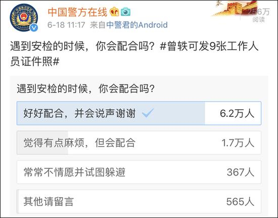 公安部新闻中心、公安部治安管理局官方微博@中国警方在线 今天中午也以此为话题,发起了“遇到安检的时候你会配合吗”的投票,选择“好好配合并会说声谢谢”的网友占绝大多数。