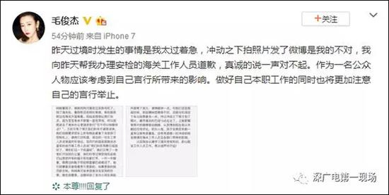 12月1日,毛俊杰删掉了爆料微博,并发文向海关关员致歉,但文内仍然提及了关员“拖延时间”等信息。