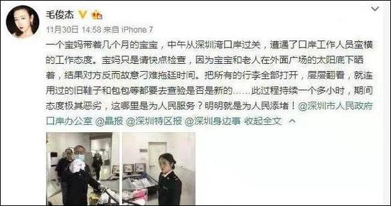 去年11月30日,毛俊杰发文称带着几个月的孩子过关时,遭到口岸工作人员故意刁难拖延时间,认为其“态度极其恶劣”“为人民添堵”,并拍下了当事查验关员的照片。