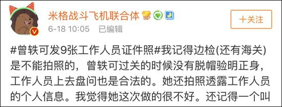除此以外,曾轶可“九宫格”曝光边检人员证件信息的行为令网友们感到不妥,指其若真对当时情况有异议可以寻求正确投诉维权渠道,而不是在禁止拍照的区域拍下边检人员的证件并多次甚至放大曝光,认为其可能触犯《出入境管理法》中的相关条例。