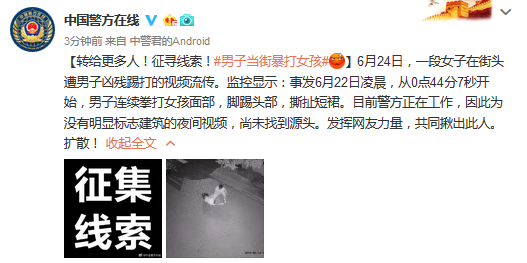 公安部新闻中心,公安部治安管理局也在其官方微博发文征询线索,称目前警方正在工作,因此为没有明显标志建筑的夜间视频,尚未找到源头。呼吁网友发挥力量,找出犯罪嫌疑人。