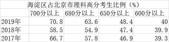 在理科方面,海淀区650分以上占北京市比例每年的增幅最多1%,600分以上的占比今年只增长0.1%。
