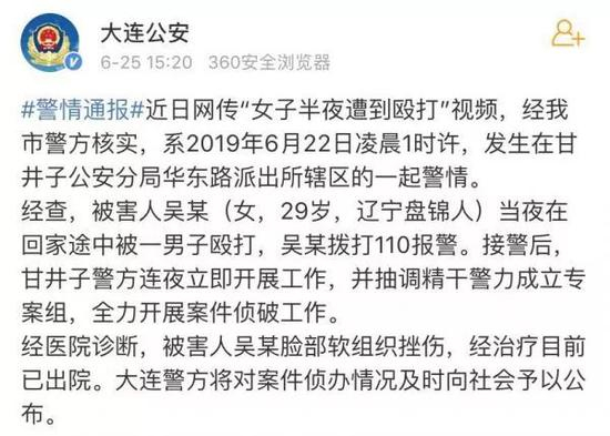 而在警情通报中,@大连公安 也透露,被害人经医院诊断,脸部软组织挫伤,经治疗目前已经出院。目前,甘井子警方已经抽调精干警力成立专案组,全力开展案件侦破工作。