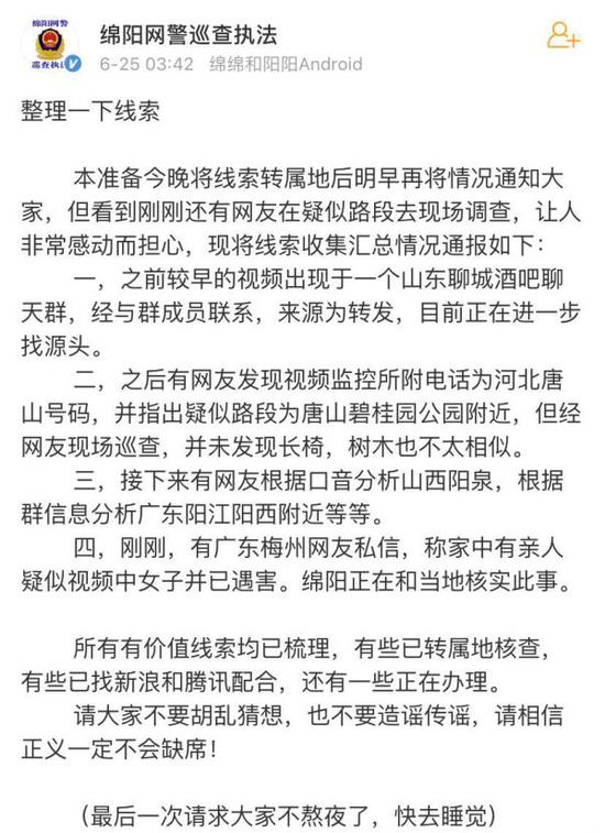 很快,在各地网友信息持续更新下,凌晨3点42分,@绵阳网警巡查执法 对案情线索进行了初步梳理,并排除了绵阳作为案发地的可能性:
