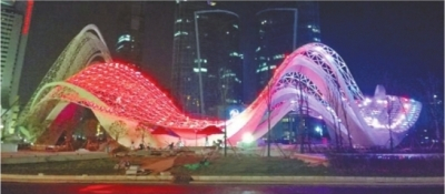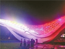中心圆盘雕塑主题为“星河”,雕塑全部采用钢结构,最大高度40米,中心直径90米,总重量近1410吨。