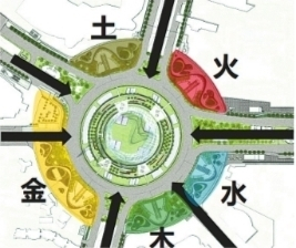 五行,即周边地下出站口的五个地块,场地与地下空间的五行元素相呼应,地块根据周边业态分为“金、木、水、火、土”五个特色板块。其中,珞喻西路至民族大道地块为“金”主题广场,民族大道至光谷街地块为“木”主题广场,光谷街至珞喻东路地块为“水”主题广场,珞喻东路至鲁磨路地块为“火”主题广场,鲁磨路至珞喻西路为“土”主题广场。