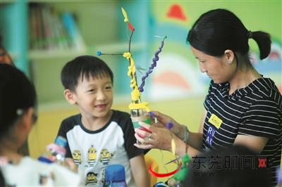 孩子们也没有闲着,大家要把光秃秃的干树枝做成非常美妙的装饰品。小朋友们把轻质粘土弄成一小撮一小撮,把它们捏在树枝上,装上纽扣当成花,插上小青老师画好剪好的树叶,立刻,原来干枯的树枝就变得栩栩如生。把这些装饰品放进爸爸妈妈用麻绳缠好的回忆瓶后,孩子们发现,原来已经废弃的牛奶瓶饮料瓶,瞬间就已经成了一个鲜活的工艺品。