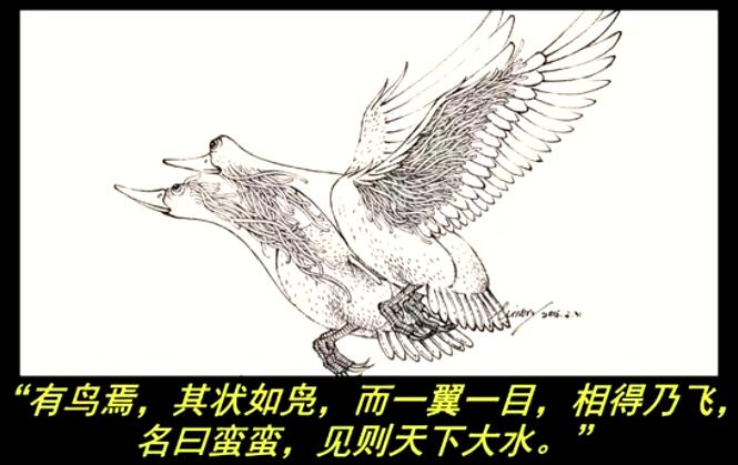对异兽“蛮蛮”的解释,原文写的是“崇吾之山 ,有鸟焉,其状如凫,而一翼一目,相得乃飞,名曰蛮蛮,见则天下大水。”