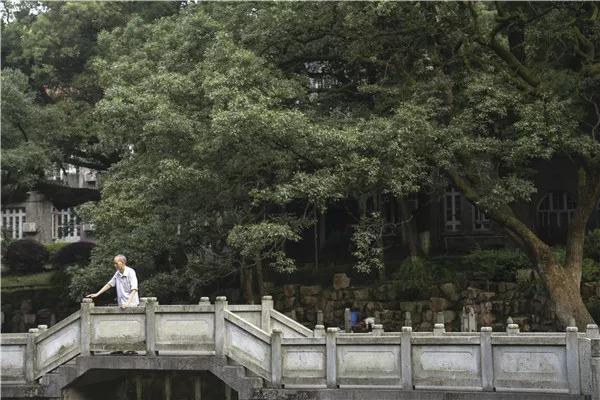 7月6日,长沙市岳王亭景区池塘附近,老人正在桥上查看树木是否有损坏。