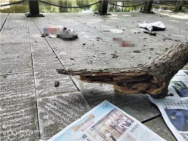 7月6日,长沙市岳王亭景区池塘附近,紧邻湖边的一颗古树树枝掉落后砸伤数人。