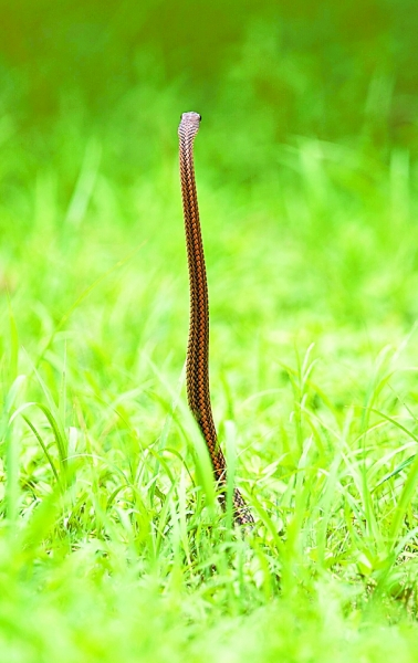 罗志兵告诉记者,7月5日下午2时许,他在植物园内的柏油路上行走,突然瞧见有一条1米多长、成年人拇指粗的蛇在路边草丛中觅食。其背部正中有明黄色纵纹,身侧有黑线纵纹。
