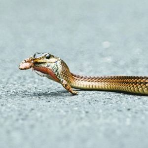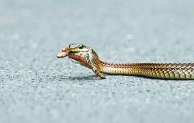 这条蛇将前部身子竖起,头部高高扬起,“样子怪吓人的”。当它瞅见有一只鹅蛋大小的青蛙在柏油路上蹦哒时,立即对青蛙发起了攻击。它快速游到柏油路上,一口将青蛙吞进口中。青蛙蹬着腿拼命挣扎,无果。