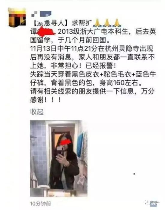 2018年11月15日,浙江大学老师、学生开始转发几条寻人启事:刚从英国留学回来没多久的浙江大学毕业生谭某某从11月13日中午开始失联,当天11时21分其在杭州灵隐寺出现后就再没有消息,谭某某身高160厘米左右,失踪当天穿着黑色皮衣+驼色毛衣+蓝色牛仔裤,背着黑色的包。