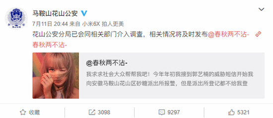 7月11日晚间,@马鞍山花山公安发布回应称,已会同相关部门介入调查,相关情况将及时发布。