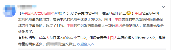 过高的食盐摄入不仅会增加高血压及心脑血管疾病的发病风险,而高血压同时也是引发中风的最危险因素之一。